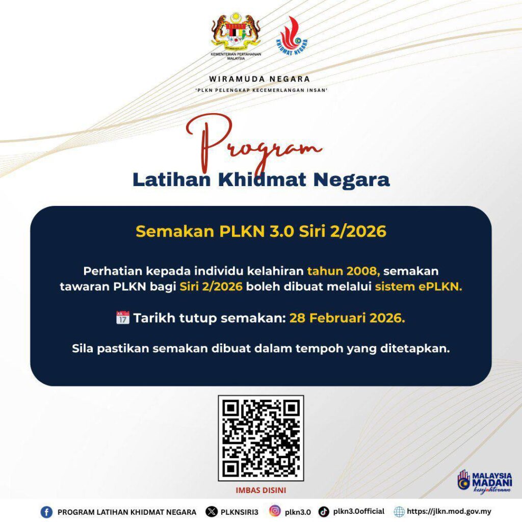 SEMAKAN PENGAMBILAN PELATIH PROGRAM LATIHAN KHIDMAT NEGARA (PLKN 3.0) SIRI 2 TAHUN 2026 DIBUKA BERMULA 20 FEBRUARI 2026