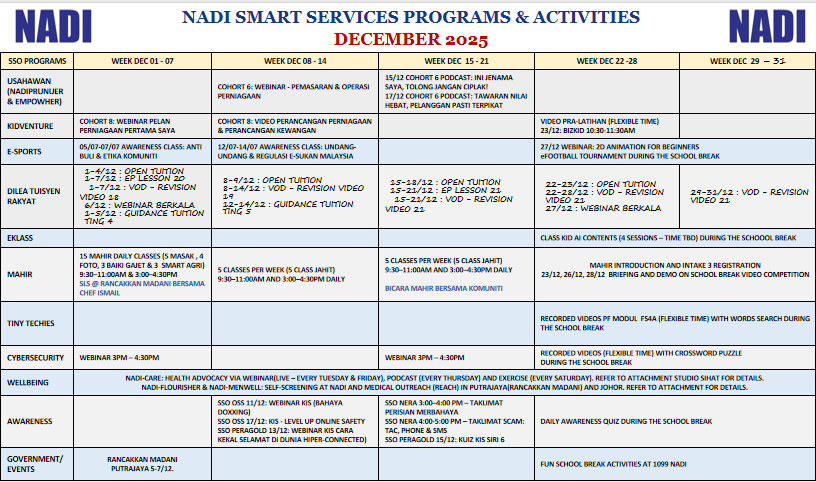 TAKWIM PERKHIDMATAN PINTAR NADI BULAN DISEMBER 2025